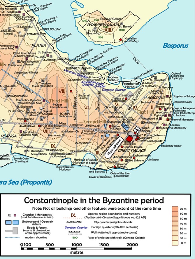 1.0 BYZANTINE CONSTANTINOPLE (Overall From Wiki)1.1 PALACE AND HIPPODROME DISTRICTS1.2 GOLDEN HORN AND AREA1.3 ST. MAMAS DISTRICT AND AREA1.4 BLACHERNAE DISTRICT AND AREA1.5 Great Palace Area1.6 The Acropolis and Area1.7 The Kastellion and GalataEastern Roman Empire Byzantine Map of 1025 ADThe Heart of Constantinople of the Ninth Century